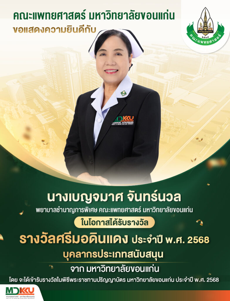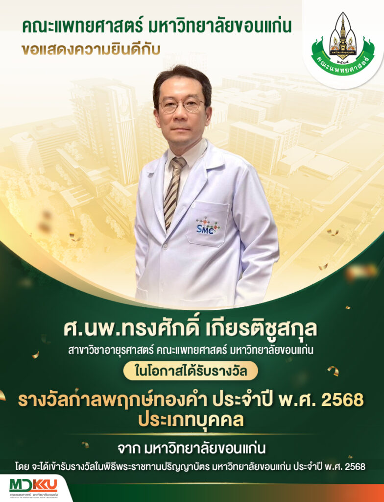 ขอแสดงความยินดีกับ บุคลากรคณะแพทยศาสตร์ที่ได้รับประกาศเกียรติคุณบุคคลและองค์กรผู้ทำคุณประโยชน์ต่อสังคมและมหาวิทยาลัยขอนแก่น ประจำปี พ.ศ. 2568