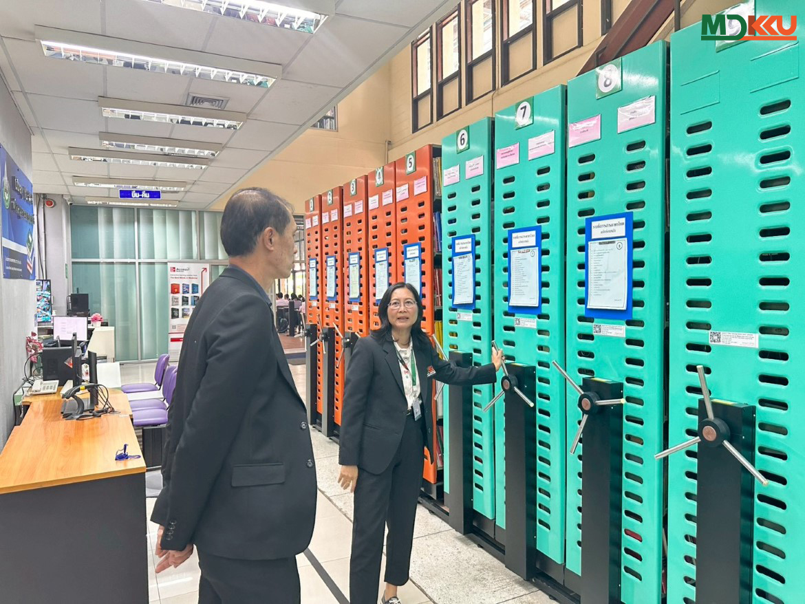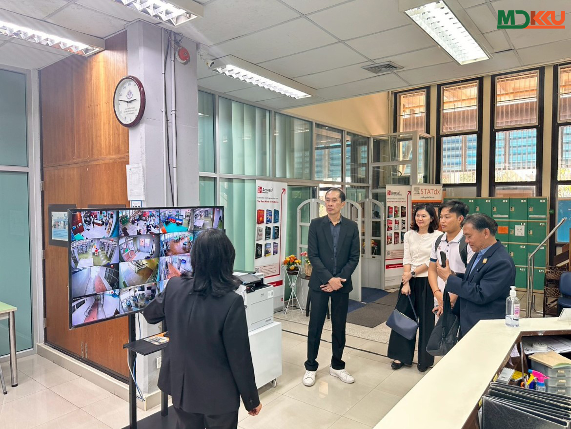 นางดุจกานต์ สุวรรณธาร หัวหน้าห้องสมุดคณะแพทยศาสตร์ นำคณะผู้แทนชมและอธิบายการทำงานของห้องสมุดที่ผสาน เทคโนโลยีดิจิทัลเข้ากับบริการสารสนเทศ ครอบคลุมการจัดทำรายการทรัพยากรอิเล็กทรอนิกส์ การหมุนเวียนทรัพยากรอัตโนมัติ การให้คำปรึกษาทางวิชาการ และโปรแกรมพัฒนาทักษะสารสนเทศสำหรับนักศึกษาและคณาจารย์