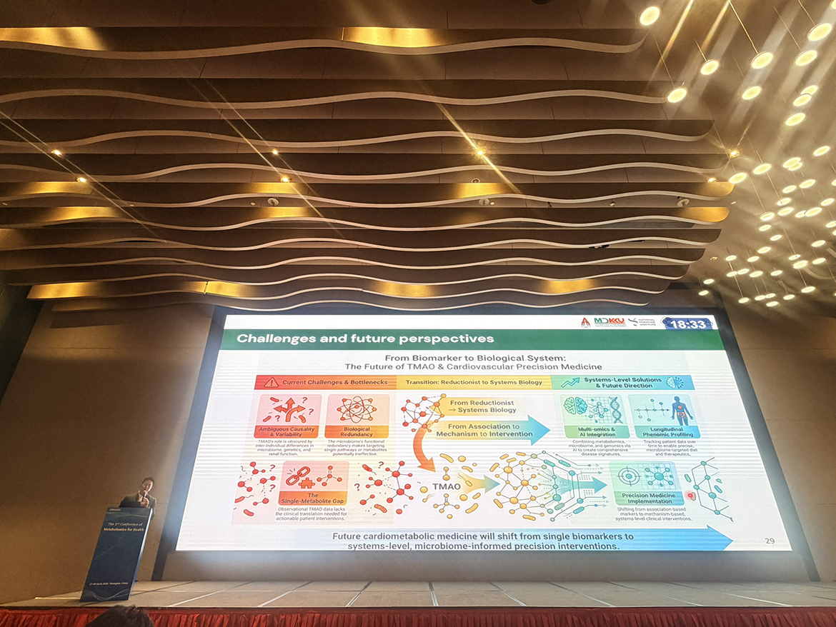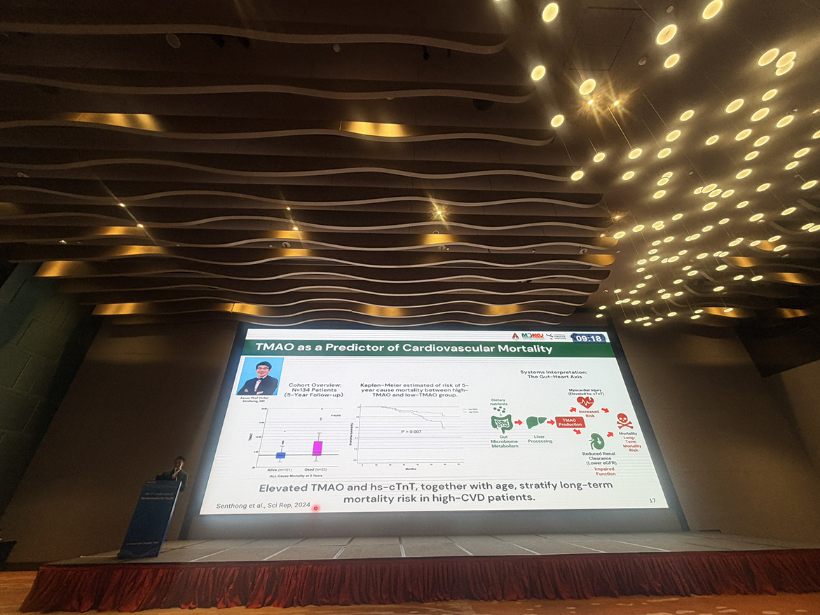 โดยในการประชุมครั้งนี้ ผศ.ดร.จุฑารพ ได้รับเชิญให้บรรยายในหัวข้อ “Decoding Diet-Microbe-Host Interactions: Integrative Omics Insights into TMAO-Driven Cardiometabolic Risk” ซึ่งเป็นหัวข้อที่สะท้อนถึงงานวิจัยแนวหน้าในด้าน Systems Biology, Phenomic Medicine และ Bioinformatics ที่เชื่อมโยงความสัมพันธ์ระหว่างอาหาร จุลชีพในลำไส้ และระบบชีวภาพของมนุษย์ เพื่ออธิบายกลไกความเสี่ยงของโรคหัวใจและหลอดเลือด