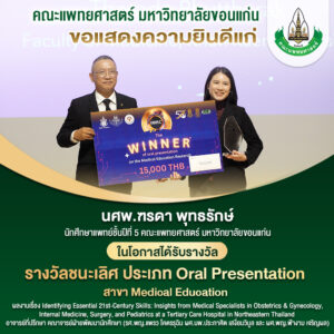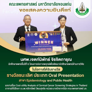 คณะแพทยศาสตร์ มหาวิทยาลัยขอนแก่น ขอแสดงความยินดีกับนักศึกษาแพทย์ คณะแพทยศาสตร์ มหาวิทยาลัยขอนแก่น ที่ได้รับรางวัลจากการประกวดผลงานวิจัยของนักศึกษาแพทย์