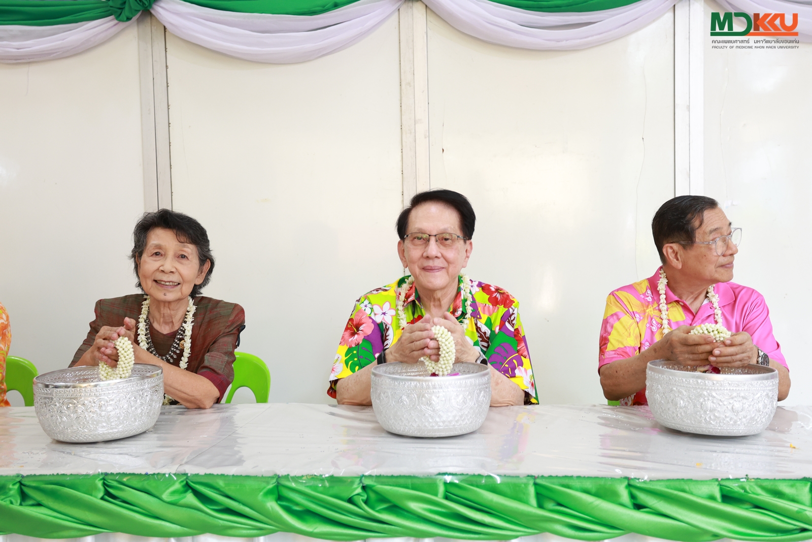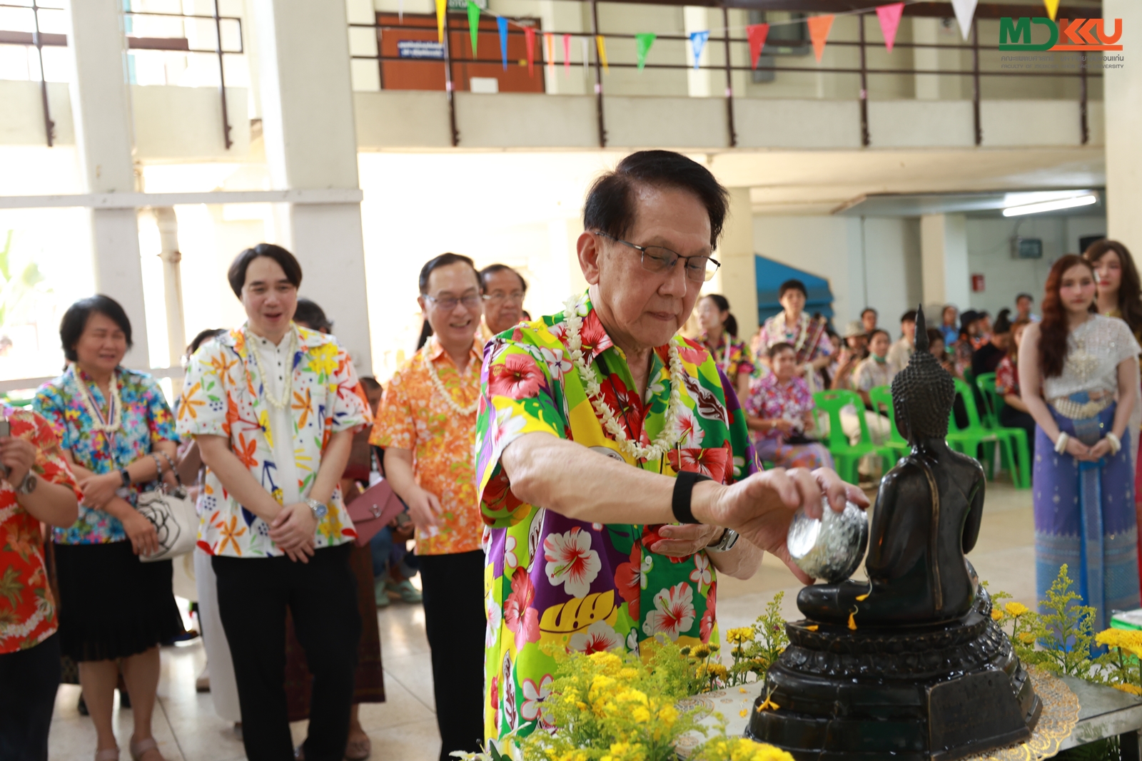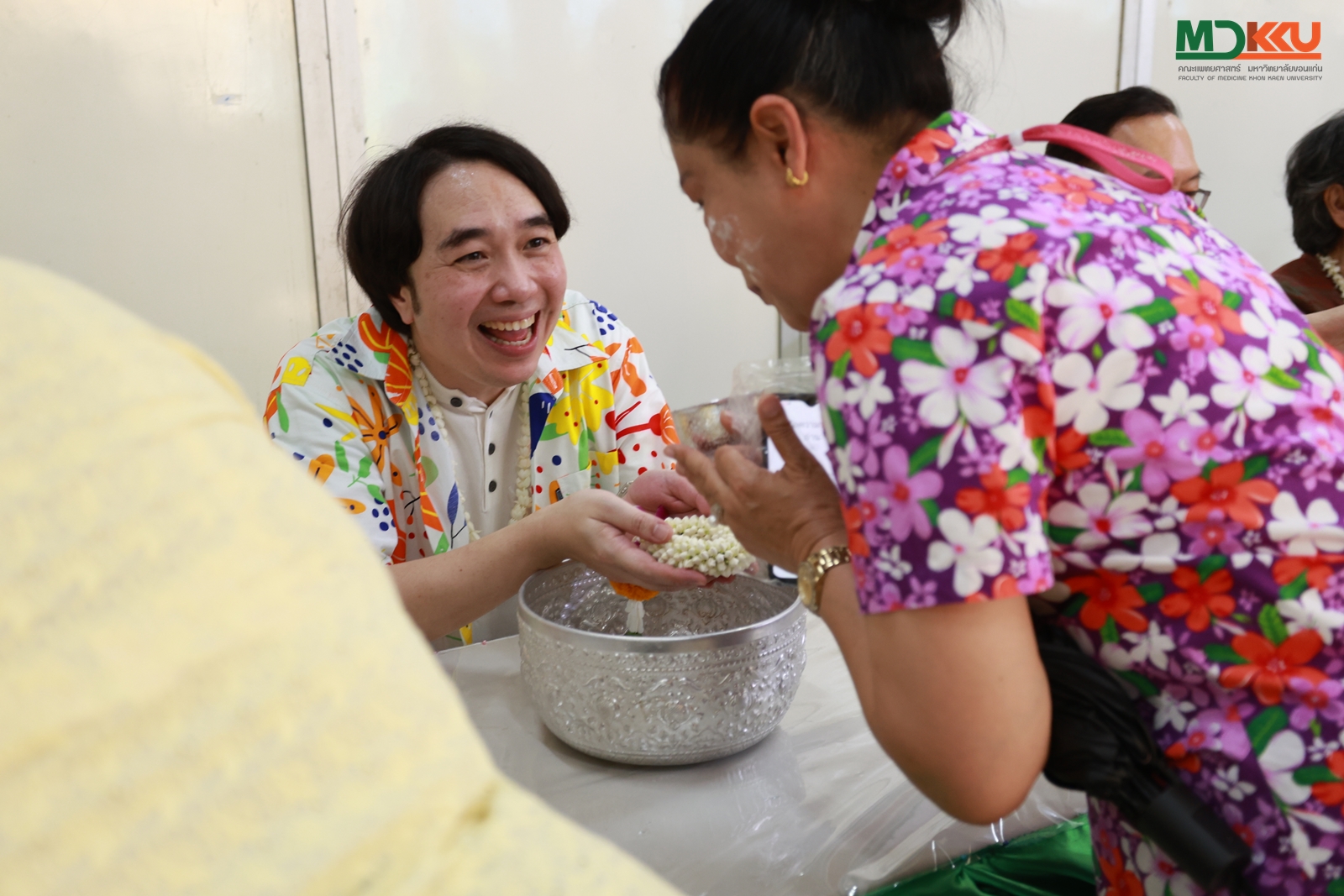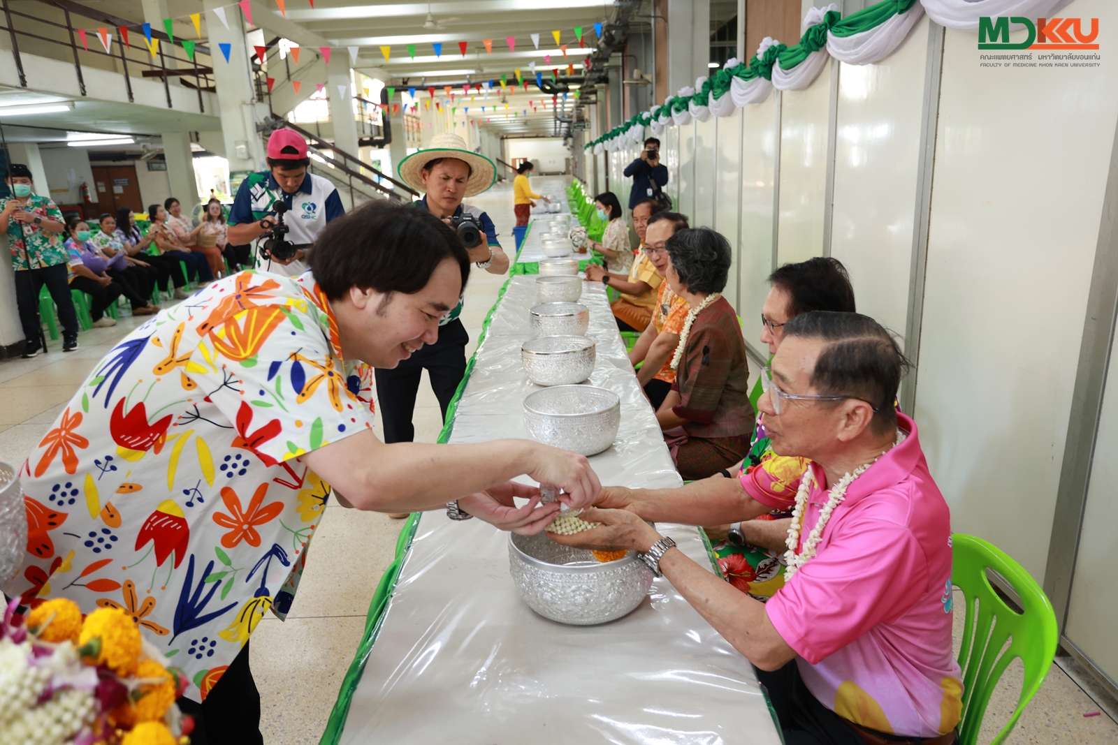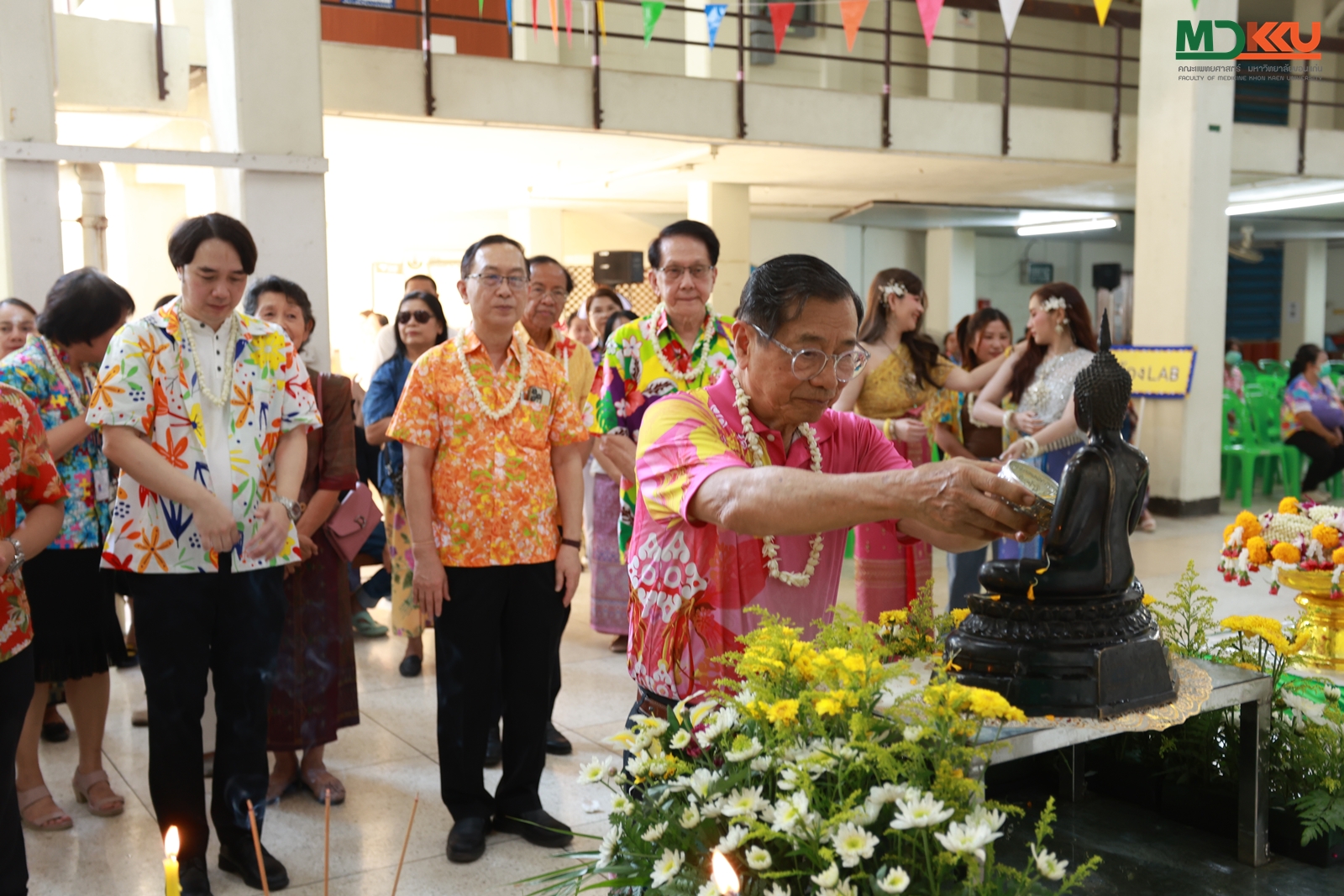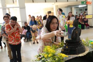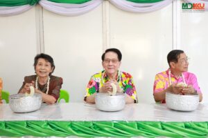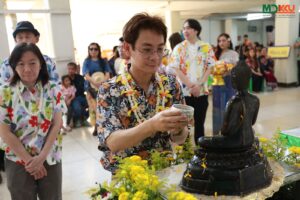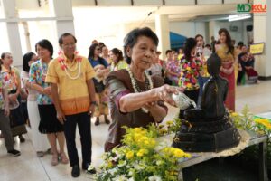 และพิธีรดน้ำดำหัว ซึ่งถือเป็นหัวใจสำคัญของประเพณีสงกรานต์ ได้รับเกียรติจาก รศ.นพ.ชาญชัย พานทองวิริยะกุล อธิการบดีมหาวิทยาลัยขอนแก่น พร้อมด้วยอดีตคณบดีคณะแพทยศาสตร์ คณะผู้บริหาร และผู้เกษียณอายุราชการ ร่วมให้พรอันเป็นมงคลแก่บุคลากรของคณะฯ