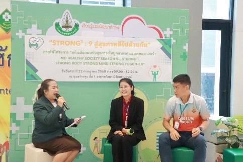 คณะแพทยศาสตร์ มหาวิทยาลัยขอนแก่น โดยหน่วยสร้างเสริมสุขภาพ งานเวชกรรมสังคม โรงพยาบาลศรีนครินทร์ จัดกิจกรรม “Strong3 : 9 สู่สุขภาพดีไปด้วยกัน” เมื่อวันที่ 22 กรกฎาคม พ.ศ. 2568 เวลา 09.00 – 12.00 น. ณ มุมสร้างสุข ชั้น 1 อาคารกัลยาณิวัฒนานุสรณ์ โรงพยาบาลศรีนครินทร์ โดยมีบุคลากรเข้าร่วมกิจกรรมจำนวน 69 คน ซึ่งกิจกรรมนี้เป็นส่วนหนึ่งของการขับเคลื่อนการสร้างเสริมสุขภาพบุคลากรภายในองค์กร ให้สอดคล้องกับ เป้าหมายการพัฒนาที่ยั่งยืนข้อที่ 3 (SDG 3) “การมีสุขภาพและความเป็นอยู่ที่ดีสำหรับทุกคนในทุกวัย”